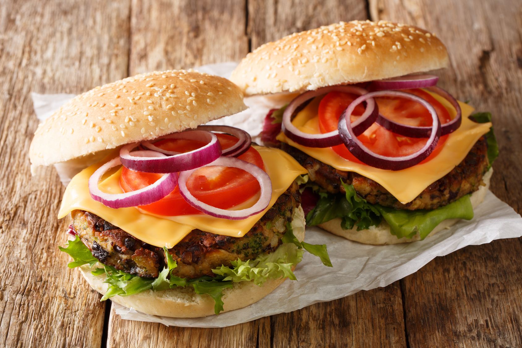 Zwei vegetarische Hamburger liegen auf einem Holzbrett