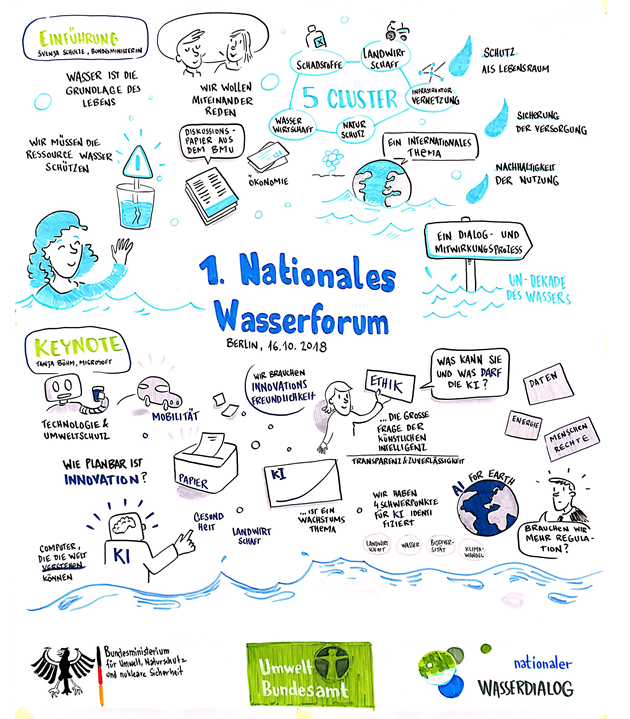 Bundesministerin Svenja Schulze eröffnete am 16. Oktober 2018 das 1. Nationale Wasserforum und startete damit den „Nationalen Wasserdialog“. Das Umweltbundesamt unterstützt den vom Bundesumweltminsiterium initiierten Dialogprozess fachlich. Neue Herausforderungen, wie der Klimawandel und technologische Neuerungen, erfordern zukunftsorientiertes Handeln. Die Wasserwirtschaft ist auf langfristig angelegte Investitionen angewiesen. Hochgradig veränderte Gewässer benötigen Zeit, bis sich nach Gewässerschutzmaßnahmen wieder intakte Biozönosen einstellen. Deshalb ist es nötig, heute über einen nachhaltigen Umgang mit der Ressource Wasser, den Schutz der Gewässerökosysteme und eine sichere Wasserver- und Abwasserentsorgung nachzudenken. Das BMU plant, bis 2030 im Dialog zwischen Bund, Ländern, Kommunen, der Wasserwirtschaft und anderen Sektoren sowie der Zivilgesellschaft und der Wissenschaft zukunftsorientierte Maßnahmen auf den Weg zu bringen. Dazu sind zwischen Januar 2019 und Februar 2020 fünf Veranstaltungen vorgesehen. Im Juni 2020 fasst der „Nationale Wasserdialog“ die Ergebnisse mit dem 2. Nationalen Wasserforum für eine BMU-Wasserstrategie „Zukunft Wasser“ zusammen.