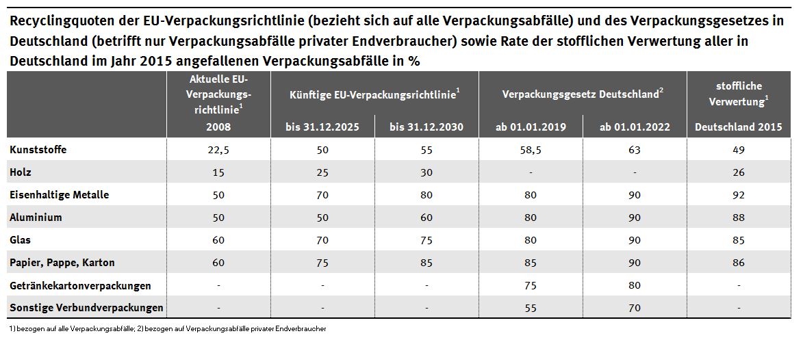 Die neuen Mindestquoten für das Recycling von Verpackungsabfällen sind – bis auf die Quote für Holz – für Deutschland durch die anspruchsvollen Zielvorgaben des Verpackungsgesetzes voraussichtlich gut erreichbar. Für Mitgliedstaaten mit aktuell geringem Recyclinganteil sind sie anspruchsvoll.