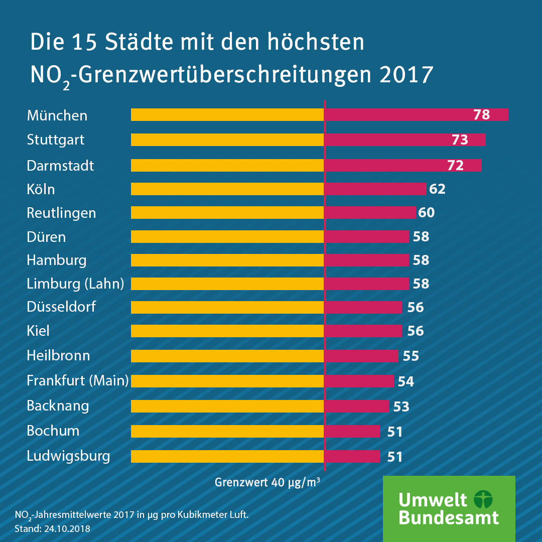Die gesamte Liste der Städte mit Grenzwertüberschreitungen (über 40 Mikrogramm pro Kubikemeter Luft im Jahresmittel) können Sie hier herunterladen.