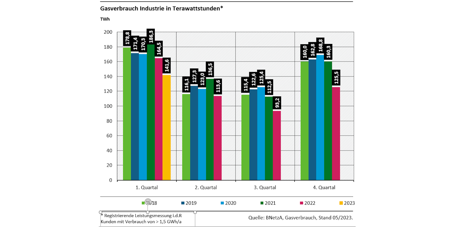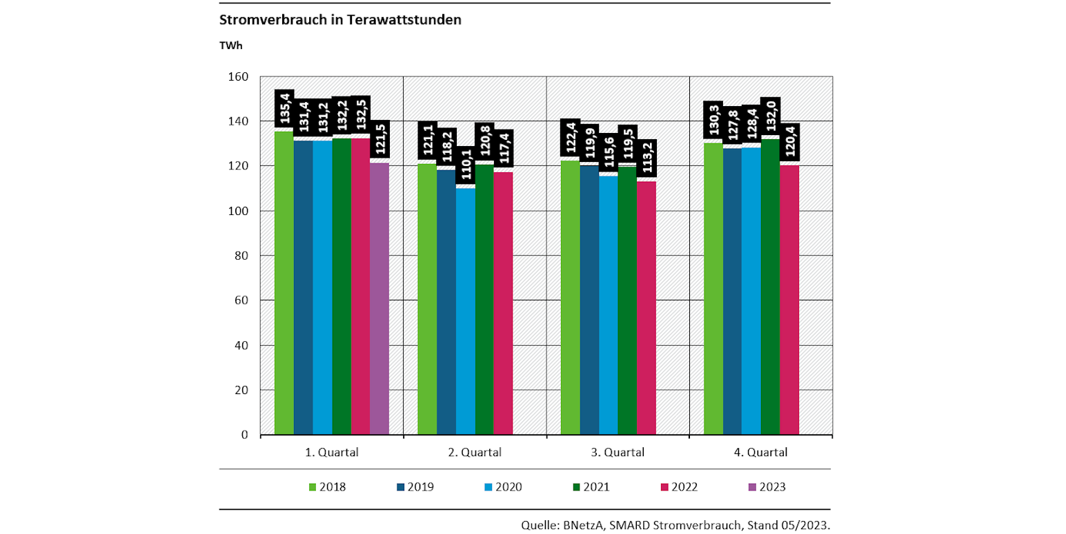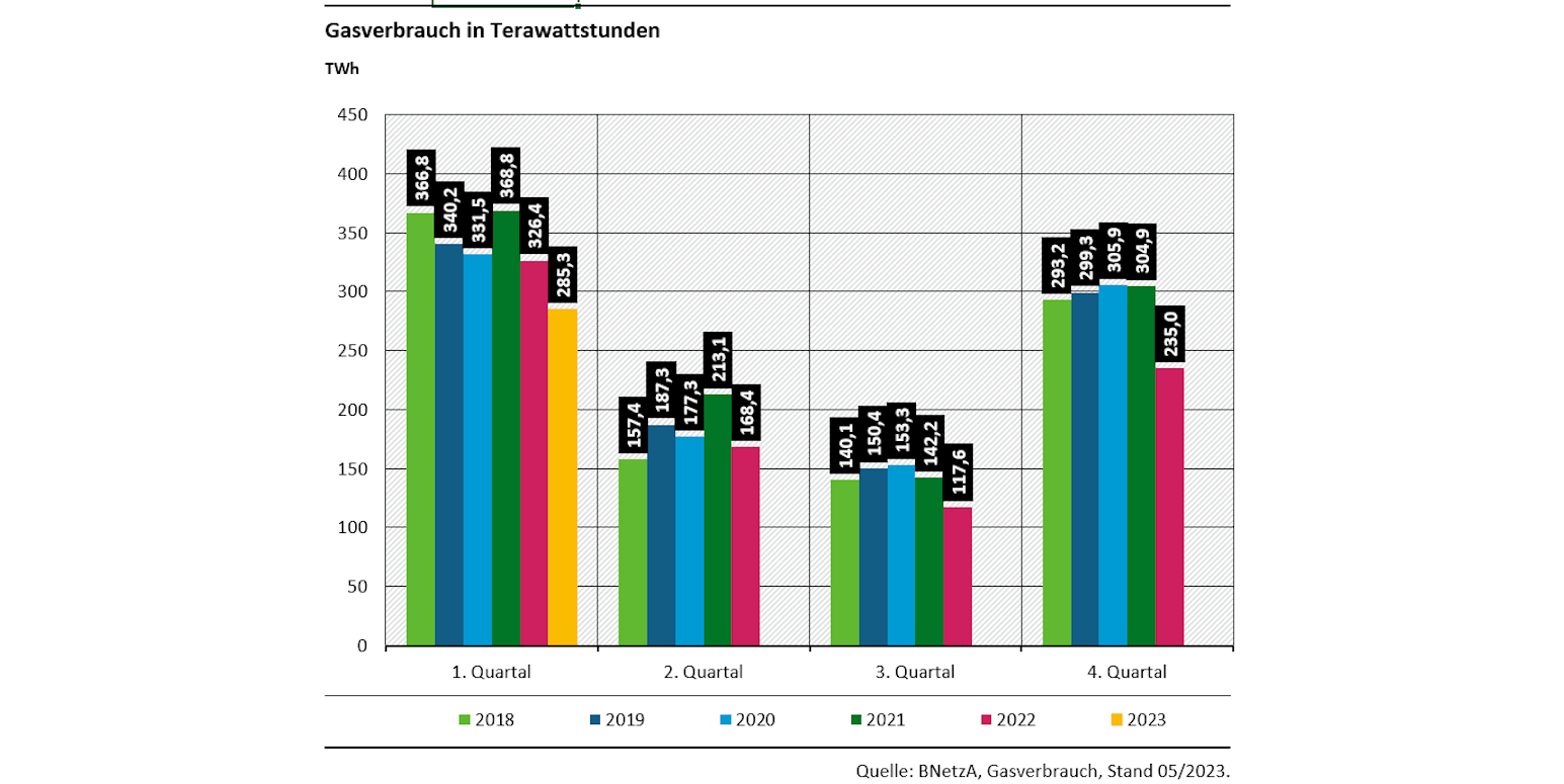 Weil aber die Daten zum EEV und PEV nur verzögert vorliegen – letztes vorläufig verfügbares Datenjahr ist 2021 – und aktuelle Trends und Maßnahmen sich daher kaum ablesen lassen, lohnt ein vertiefter Blick. Und der könnte Hoffnung machen. Wesentlich aktueller als PEV oder EEV liegen Daten zu Strom- und Gasverbrauch vor. Beide Verbräuche sind in Deutschland im quartalsweisen Vergleich mit den Vorjahren ab der zweiten Jahreshälfte 2022 deutlich gesunken.