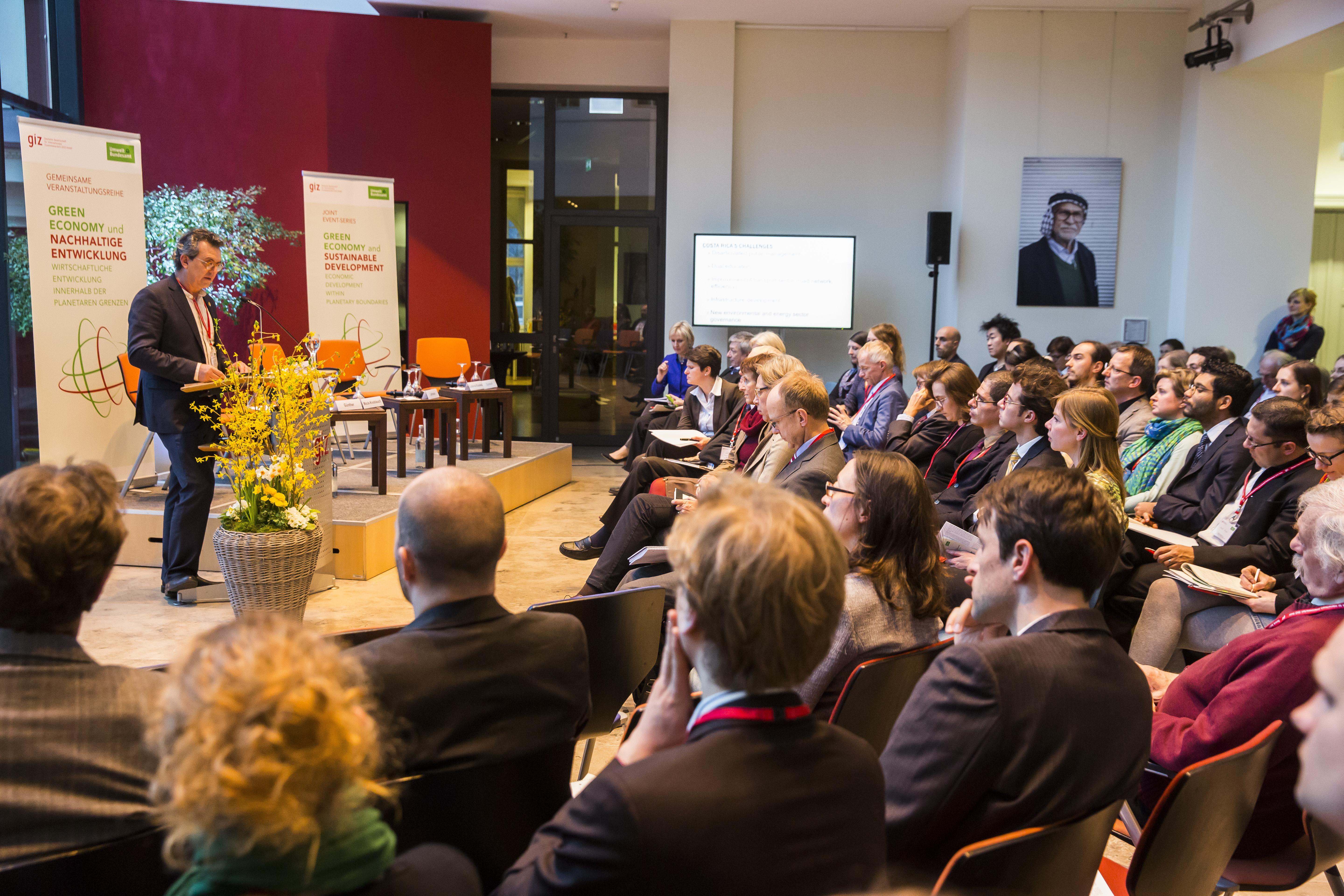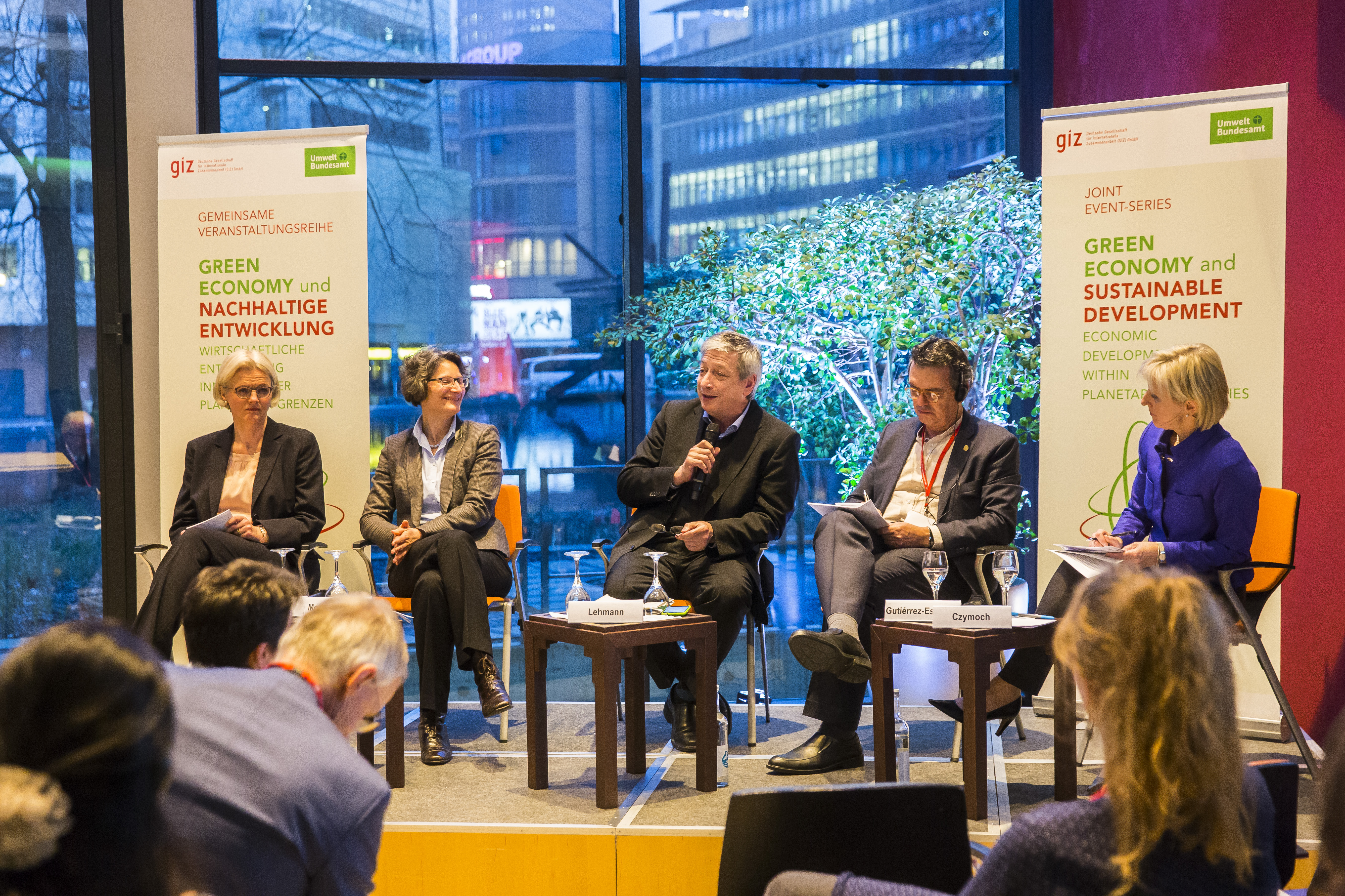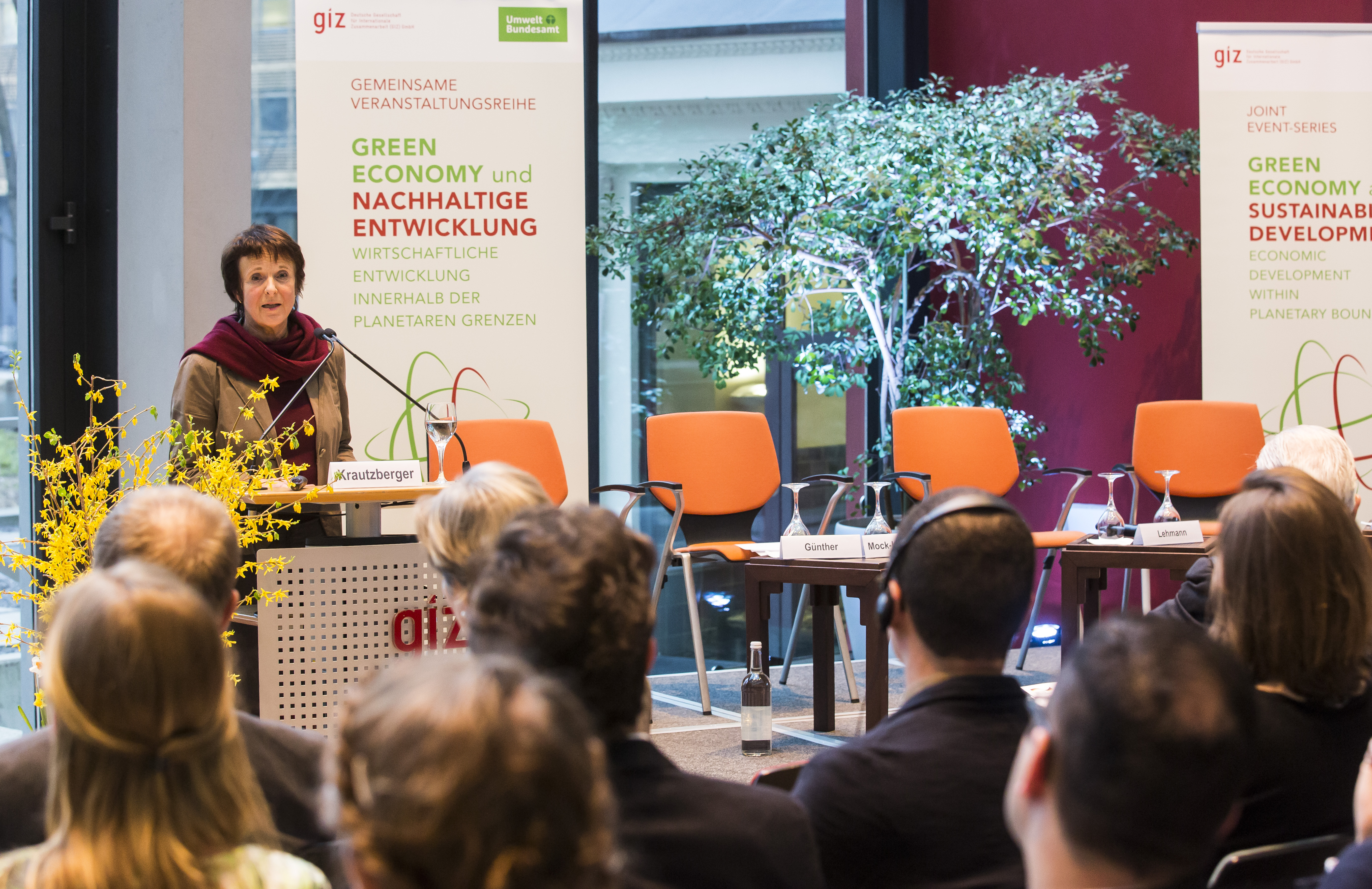 Am 24. März 2015 luden das Umweltbundesamt (UBA) und die Deutsche Gesellschaft für Internationale Zusammenarbeit (GIZ) GmbH zur ersten Veranstaltung ihrer gemeinsamen Reihe "Green Economy und Nachhaltige Entwicklung - Wirtschaftliche Entwicklung innerhalb der planetaren Grenzen" in die GIZ-Repräsentanz Berlin ein. Als Gastgeberinnen begrüßten Tanja Gönner, Vorstandssprecherin der GIZ, und Maria Krauzberger, Präsidentin des UBA, das Publikum.