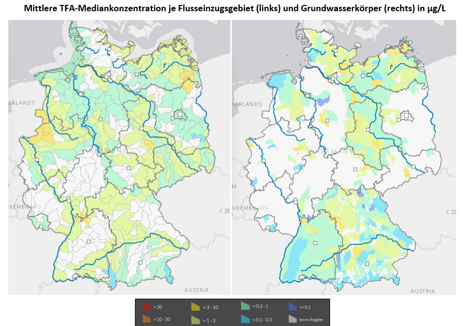 Eine erstmalig zu TFA – ein sehr mobiler und persistenter Stoff – erstellte interaktive Karte des Umweltbundesamtes zeigt die flächenhaften TFA-Funde in Deutschland in Oberflächengewässern und Grundwasser mit Hotspots entlang der Flusssysteme von Rhein und Elbe. TFA lässt sich großmaßstäbig nicht wieder aus der Umwelt entfernen und reichert sich daher in der Umwelt an.