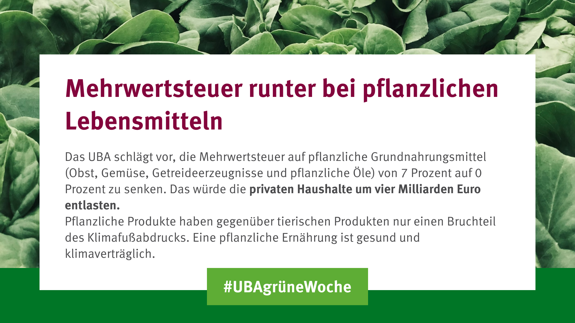 Eine Grafik mit den UBA-Forderung der Mehrwertsteuersenkung für pflanzliche Lebensmittel auf 0 %. #UBAgrüneWoche: Mehrwertsteuersenkung für pflanzliche Nahrungsmittel