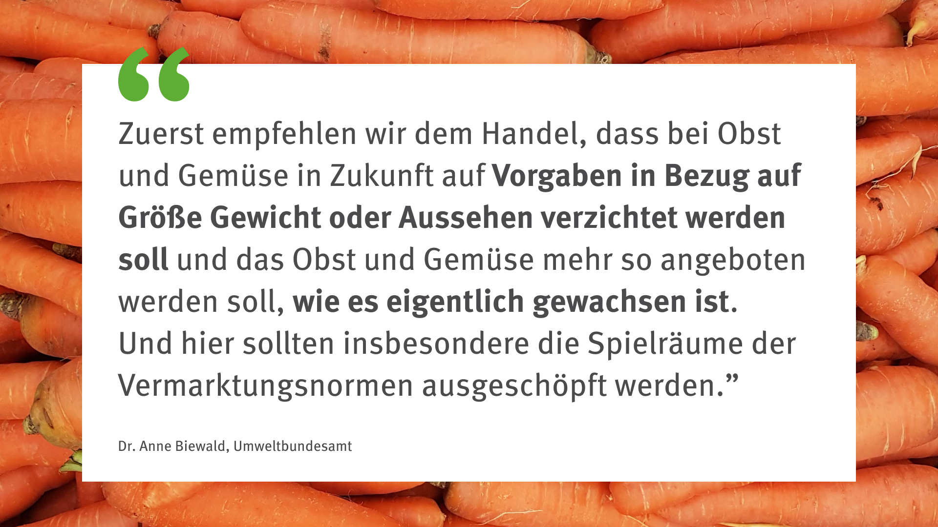 Eine Grafik mit einem Zitat von einer UBA-Mitarbeiterin zur Senkung handelsspezifischer Vorgaben von Obst und Gemüse. Die strengen Vorgaben des Handels an das Aussehen und die Größe von Obst und Gemüse belasten die Umwelt, denn häufig müssen für ihre Erfüllung zusätzlich Pflanzenschutz- und Düngemittel eingesetzt werden. #UBAgrüneWoche: Unperfektes Gemüse