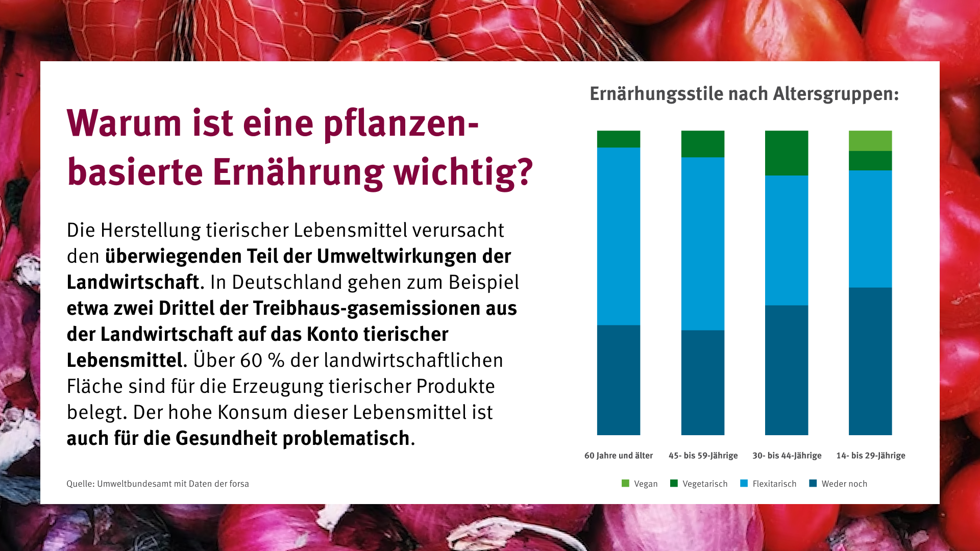 Die Förderung pflanzlicher Ernährung durch eine Mehrwertsteuerbefreiung für pflanzliche Grundnahrungsmittel oder weniger Lebensmittelverschwendung – anlässlich der Agrarmesse „Grüne Woche“ hat das UBA Maßnahmenvorschläge und Informationen zusammengestellt, um Landwirtschaft und Ernährung umweltfreundlicher zu gestalten.