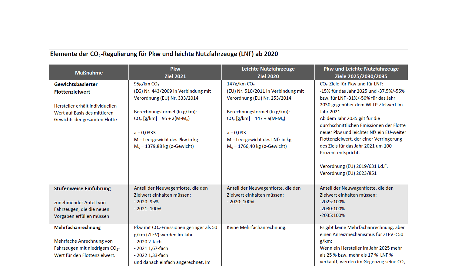 Durch die Verordnungen (EG) 443/2009 und (EU) 333/2014 bzw. (EU) 510/2011 und (EU) 253/2014 wurden die CO2-Emissionen für Pkw bzw. für LNF in Europa noch bis zum Jahr 2021 getrennt reguliert. Alle neu zugelassenen Pkw dürfen im gewichtsbezogenen Mittel seit dem Jahr 2015 130 g CO2/km nicht überschreiten. Seit dem Jahr 2020 gilt ein schärferer Zielwert von 95 g CO2/km, der zunächst von 95 Prozent der Neuwagenflotte eingehalten werden muss und dann ab 2021 für die gesamte Flotte gilt. Seit dem Jahr 2017 bzw. 2020 gilt zudem ein gewichtsbasierter CO2-Zielwert für leichte Nutzfahrzeuge von 175 bzw. 147 g CO2/km.