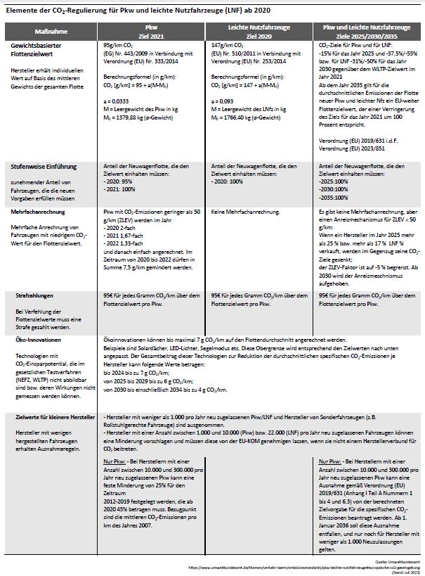 Die CO2-Regulierung für die Zieljahre 2020/2021 beinhaltet neben den Zielwerten verschiedene weitere Elemente, wie beispielsweise die Mehrfachanrechnung von emissionsfreien und emissionsarmen Fahrzeugen (Zero- and Low-Emission Vehicles (ZLEV)), Öko-Innovationen für CO2-Spartechniken, deren Wirkung im offiziellen Testverfahren nicht nachgewiesen werden kann, aber auch Strafzahlungen im Fall einer Nichteinhaltung der Zielwerte (siehe Tabelle „Elemente der CO2-Regulierung für Pkw und leichte Nutzfahrzeuge (LNF) ab 2020“).