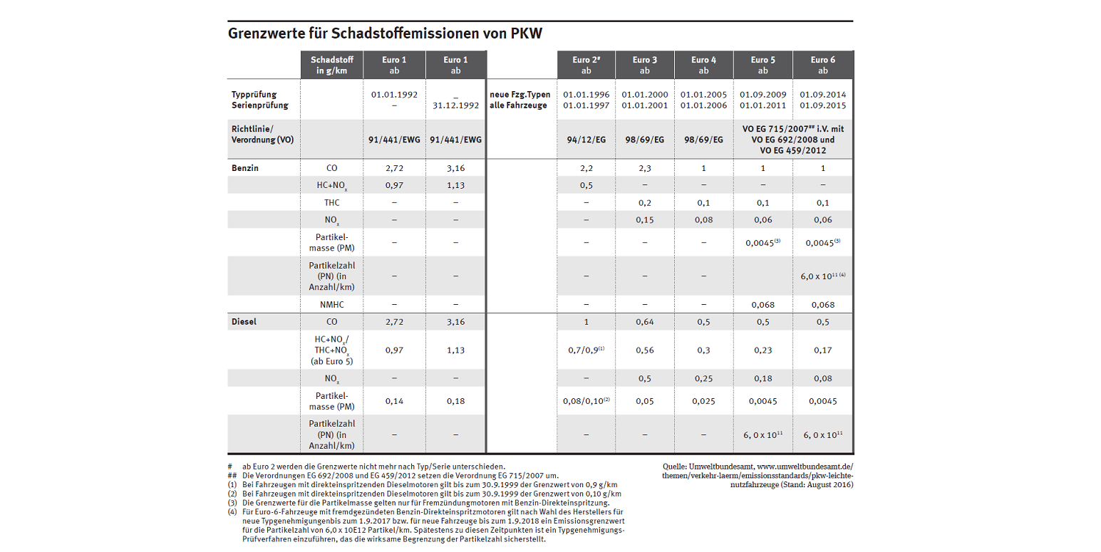Die wesentlichen Änderungen innerhalb der Emissionsnorm Euro 6 mit den jeweiligen Emissionsnormen Euro 6b bis 6e und Euro 7 zeigt die nachfolgende Tabelle.