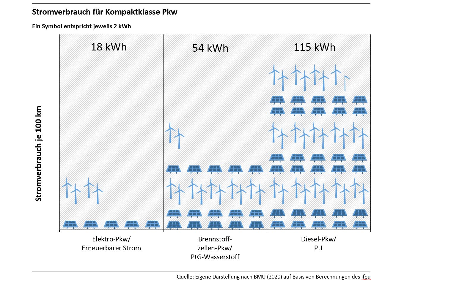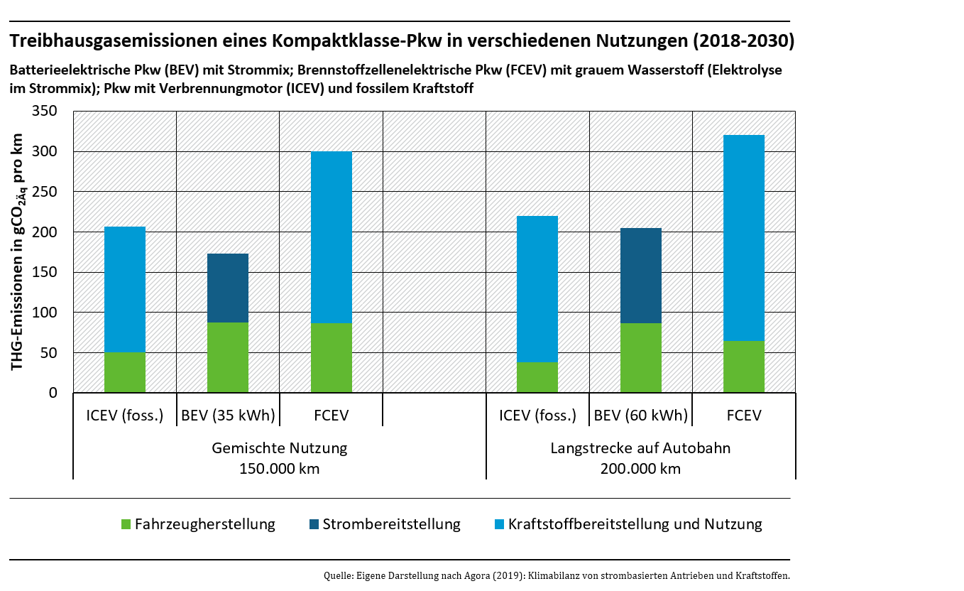 Im Vergleich zur Nutzung von grünem Wasserstoff im Verkehr ist die direkte Nutzung von erneuerbarem Strom in batterieelektrischen Fahrzeugen energieeffizienter, kostengünstiger und klimafreundlicher. Im Straßenverkehr ist die Nutzung von grünem Wasserstoff sogar die volkswirtschaftlich teuerste Option aller postfossilen Antriebe und Kraftstoffe, die langfristig einen treibhausgasneutralen Verkehr ermöglichen. Wasserstoff im Verkehr sollte daher, wenn überhaupt nur in den Bereichen eingesetzt werden, in denen eine direkte Nutzung von erneuerbarem Strom nicht möglich ist. Dies ist insbesondere dann der Fall, wenn ein hoher Energiebedarf oder große Reichweiten erforderlich sind, wie beispielsweise im Seeverkehr, im internationalen Flugverkehr oder unter bestimmten Umständen im Straßengüterfernverkehr. Der Schienenverkehr kann mindestens mittelfristig nahezu vollelektrisch betrieben werden – ein Markthochlauf des Einsatzes von grünem Wasserstoff oder der Brennstoffzelle ist hier nicht notwendig.