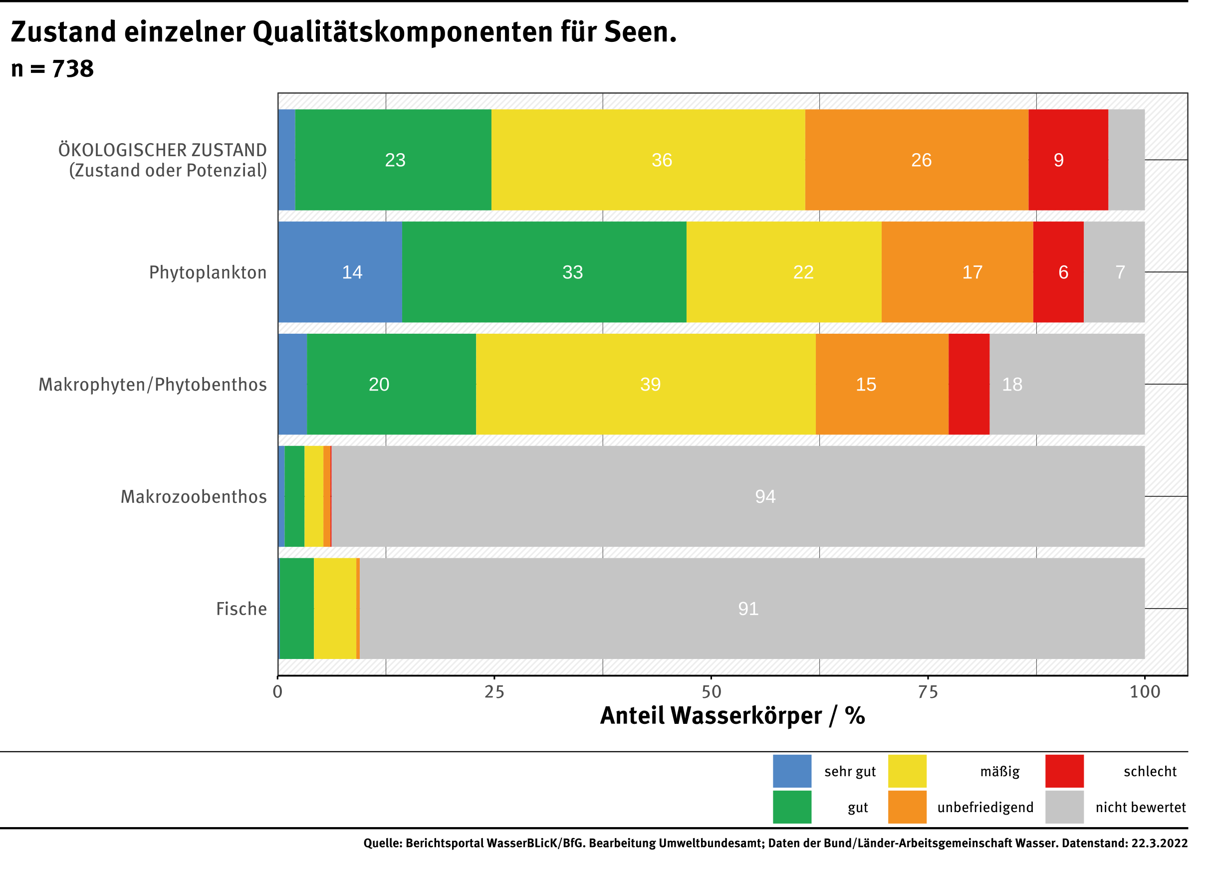 Nur 24,7 % der Seen in Deutschland (n = 738, größer als 50 Hektar) weisen gegenwärtig einen „sehr guten“ oder „guten“ ökologischen Zustand auf. Mehr als ein Drittel unserer Seen ist nach Wasserrahmenrichtlinie (WRRL) als „unbefriedigend“ oder „schlecht“ klassifiziert, weil zu viele Nährstoffe (vor allem Phosphor) sie belasten und ihre Ufer unter Freizeitaktivitäten sowie Besiedlung leiden. Mehr über die Ergebnisse erfahren Sie hier