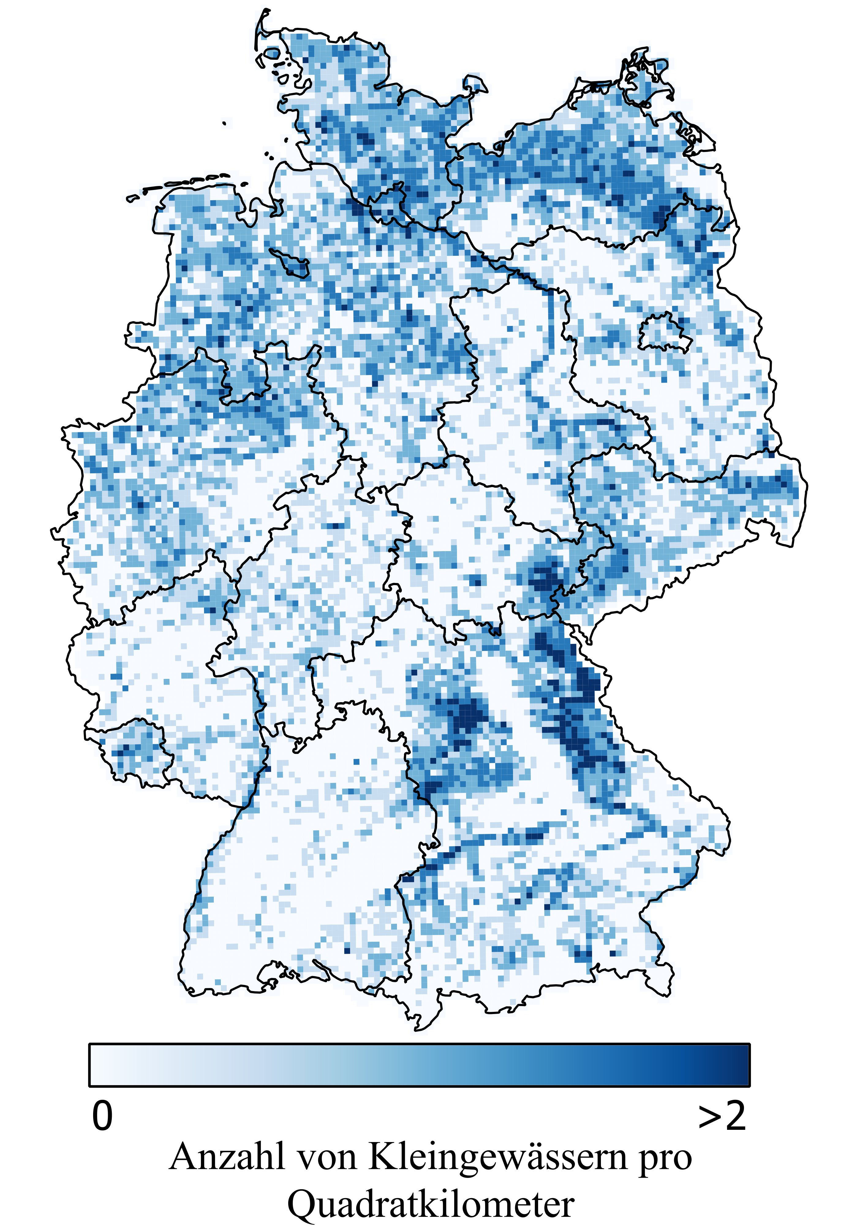 Stehende Kleingewässer sind in Deutschland regional unterschiedlich verteilt ( sh. Karte). Besonders viele finden sich in Bayern und Thüringen, vor allem in Fischteichgebieten, die oft schon im Mittelalter durch das Aufstauen kleiner Bäche entstanden sind. Auch in Nordostdeutschland gibt es viele Kleingewässer in Landschaften, die früher von Gletschern geformt wurden. Dort findet man zum Beispiel sogenannte Sölle. Das sind flache, runde Gewässer, die durch das Auftauen eingeschlossener Eisblöcke entstanden sind. Stehende Kleingewässer finden sich auch in den Flussauen großer Flüsse wie Elbe oder Donau. In den Alpen und Mittelgebirgen gibt es dagegen nur wenige solcher Gewässer.