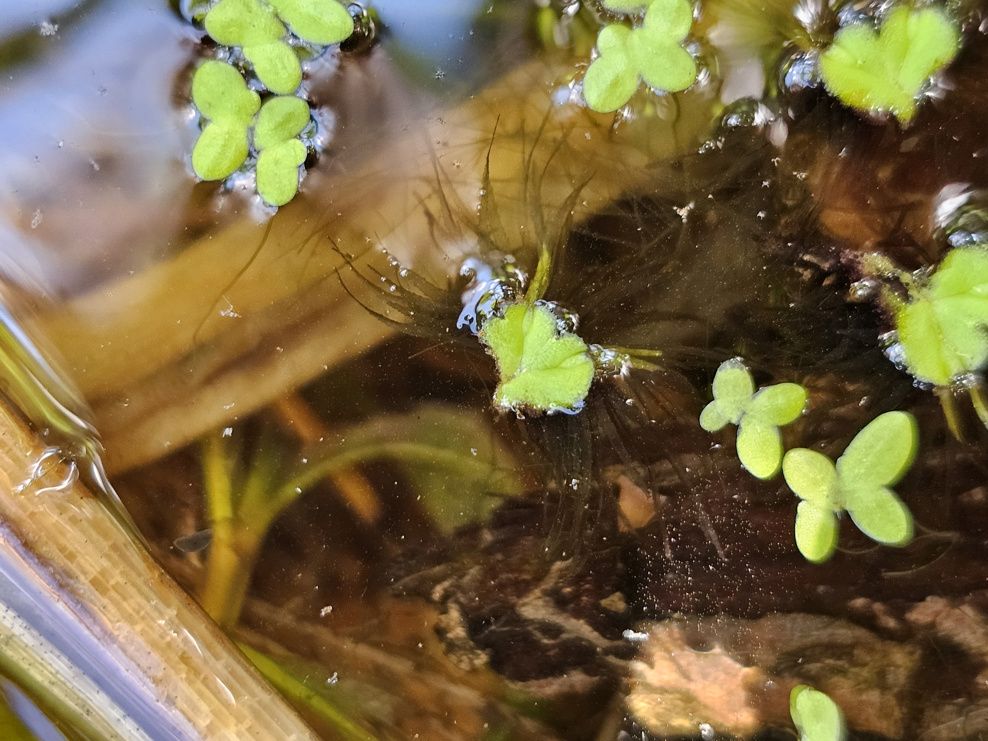 Schwimmlebermoos inmitten von Wasserlinsen