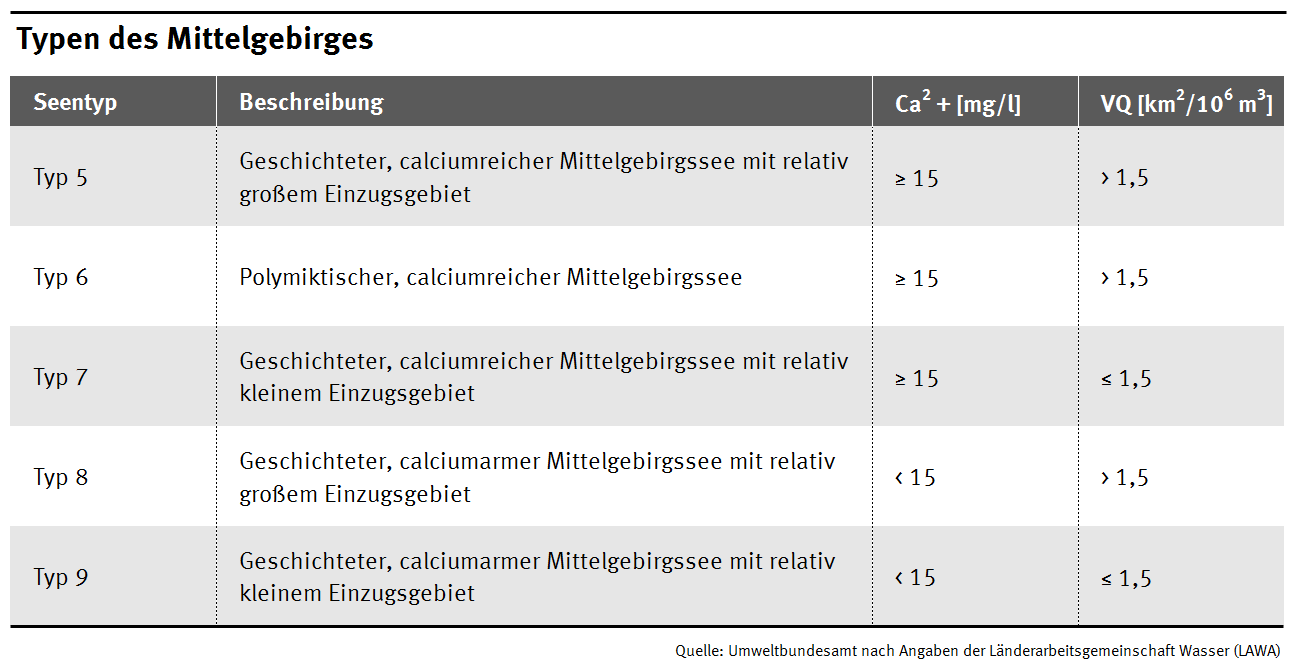 Die Seentypen 5-9 gehören zu den Typen des Mittelgebirges. Dort herrscht generell ein Calciumgehalt größer oder gleich 15 und ein Volumenquotient von 1,5 Typen des Mittelgebirges