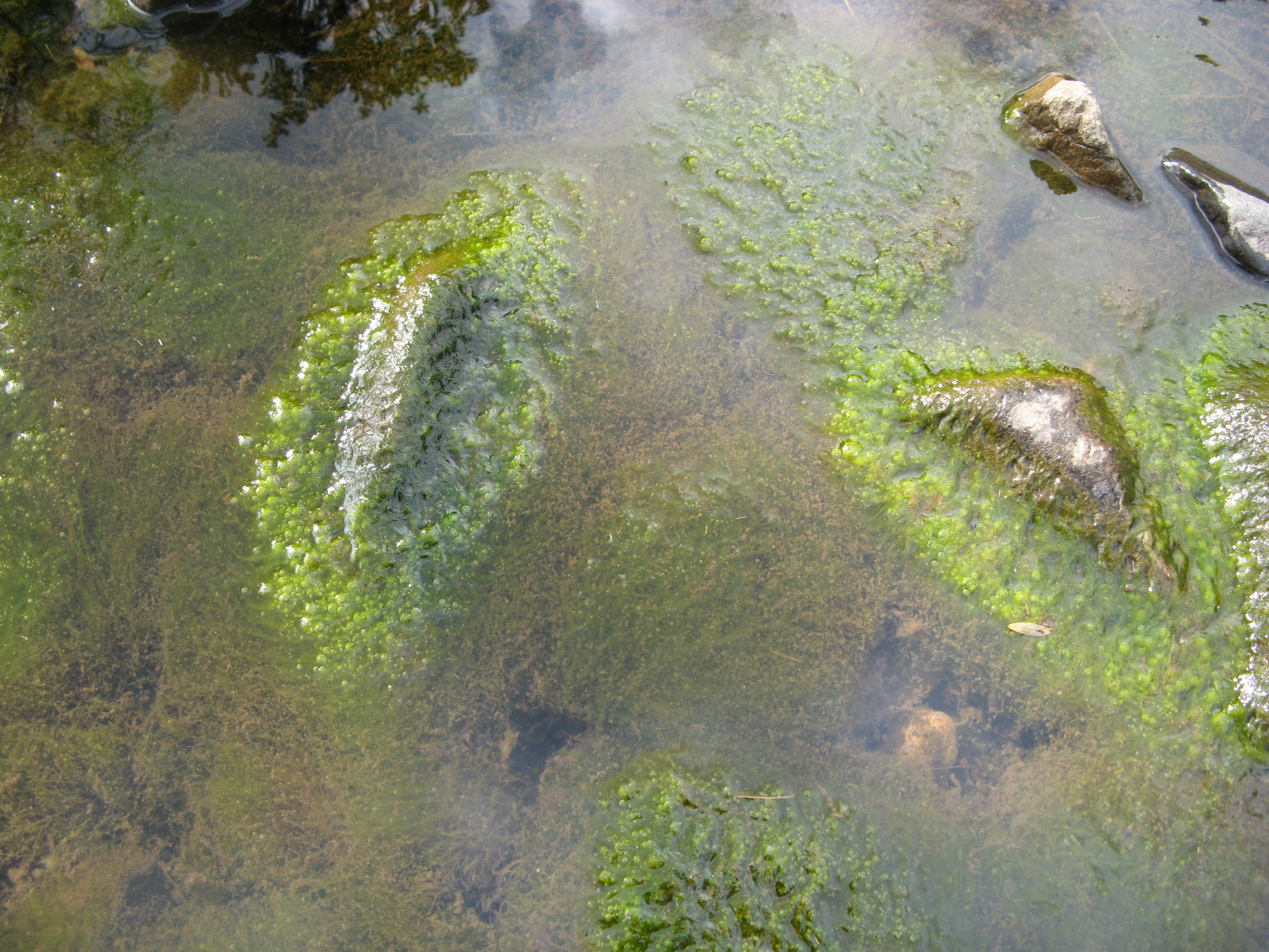 Viele grüne Algen, die sich um Steine herumlagern