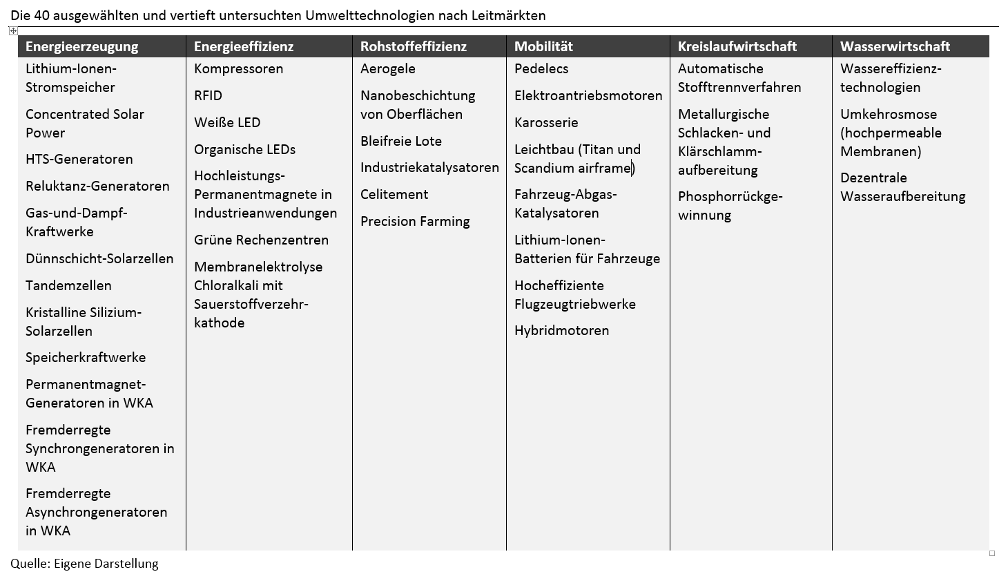 - Umwelttechnologien, die Substitutionsoptionen besitzen, welche noch nicht im Markt etabliert sind, aber großes Potential für eine absehbare Marktreife besitzen. Diese Technologien sind ökonomisch noch nicht wettbewerbsfähig oder die Entwicklung ist noch nicht vollständig ausgereift. Darunter fallen weiße OLED anstelle von weißen LED sowie Permanentmagnet-Generatoren für Windkraftanlagen.