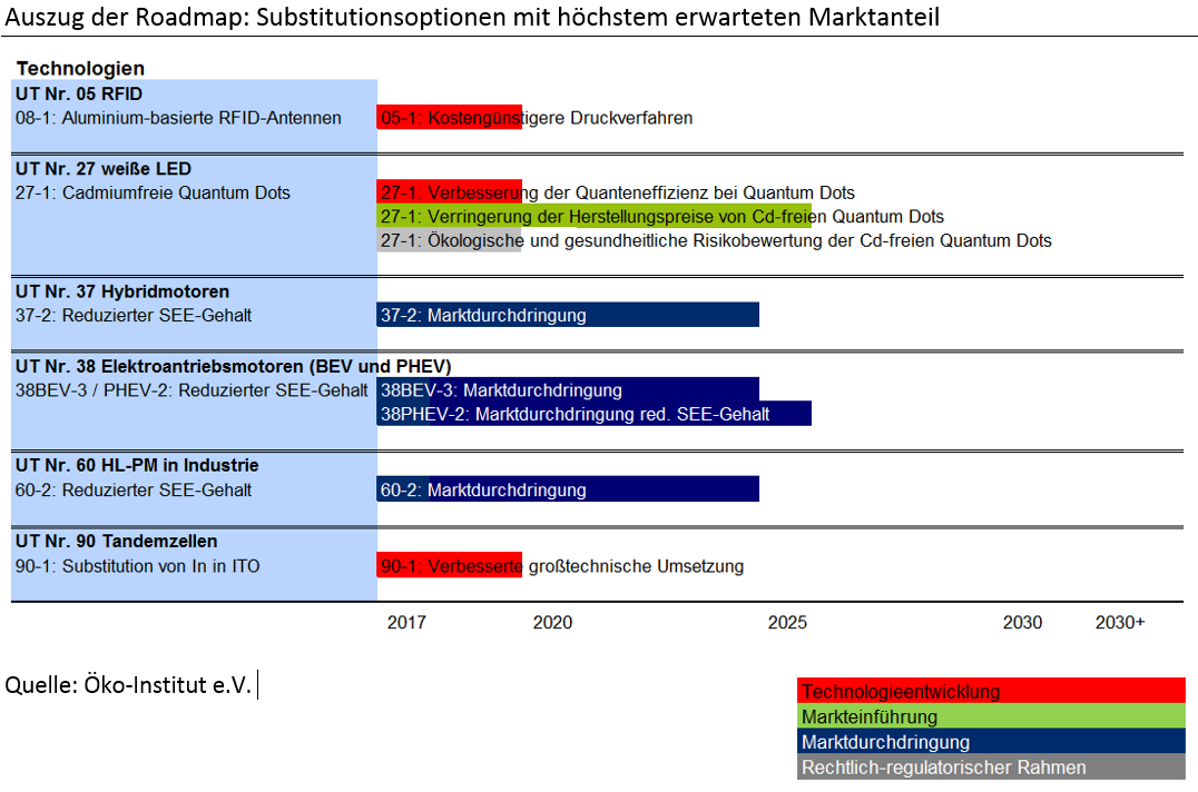 - Umwelttechnologien, für die bereits heute Substitutionsalternativen auf den Markt vorhanden sind und kritische Metalle substituiert werden. Hierunter fallen bleifreie Lote, Fahrzeug-Abgas-Katalysatoren, Elektroantriebsmotoren in vollelektrischen Pkw, Hochleistungs-Permanentmagnete in der Industrie, Dünnschicht-Solarzellen, Tandemzellen, Concentrated Solar Power (CSP)-Technologie und RFID.
