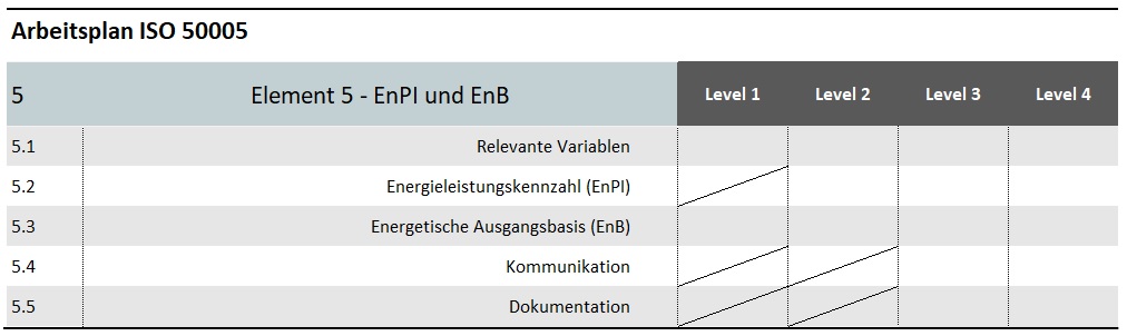 Die Anforderungen des Levels sind erfüllt, wenn für alle SEUs die relevanten Variablen und deren Auswirkung auf die aktuelle Energieeffizienz vorliegen. Nutzen Sie dazu die Hilfestellung „Energieleistungskennzahlen“.