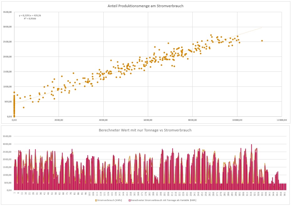 Identifizieren und quantifizieren Sie die für Ihren Energieverbrauch potenziell relevanten Variablen. Führen Sie eine grundlegende erste Analyse auf Basis des Energieverbrauchs anhand einer ausgewählten Variable durch. Nutzen Sie dazu das Tabellenblatt „Element 5 – 1.2“ der Hilfestellung „Energieleistungskennzahlen“ und kopieren Sie Ihren Energieverbrauch und die Daten der potenziell relevanten Variable mit dem entsprechenden Datum in die ersten drei Spalten. Sie können dabei tägliche, wöchentliche, monatliche oder jährliche Daten verwenden. Der ermittelte R²-Wert, definiert das Bestimmtheitsmaß und zeigt, wieviel Prozent der Schwankungen des Energieverbrauchs sich durch die betrachtete Variable – etwa das Produktionsvolumen – erklären lassen. In der Regel können Sie mit der Produktionsmenge bereits einen hohen Anteil des Energieverbrauchs erklären. Ein Beispiel für den R²-Wert wird in der Hilfestellung „Energieleistungskennzahlen“ in der oberen Grafik oben links angezeigt. Im Beispiel beträgt dieser R² = 0,9566 was zeigt, dass sich 95 % der Veränderungen im Energieverbrauch durch Schwankungen in der Produktionsmenge erklären lassen. Um die untere Grafik korrekt darzustellen müssen Sie die Funktion, welche in der oberen Grafik über dem R²-Wert angezeigt wird in die vierte Berechnungsspalte einfügen.