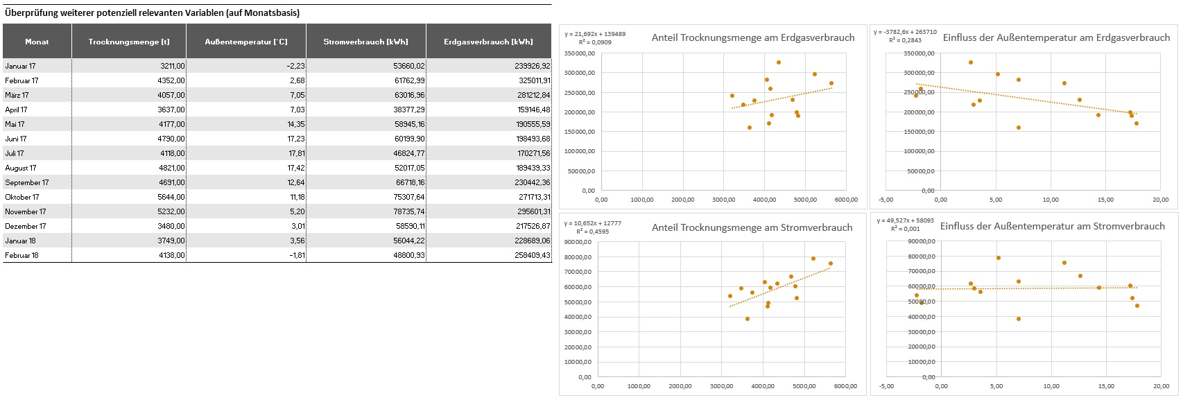 Führen Sie eine gründlichere Überprüfung weiterer relevanter Faktoren durch und identifizieren Sie solche, die den Energieverbrauch zusätzlich erheblich beeinflussen. Nutzen Sie dazu das Tabellenblatt „Element 5 – 1.3“ der Hilfestellung „Energieleistungskennzahlen“. Im Beispiel erkennen Sie den Einfluss der Außentemperatur auf den Erdgasverbrauch von ca. 30 % sowie den Einfluss der Trocknungsmenge auf den Erdgasverbrauch von ca. 10 %. Es ist zudem zu erkennen, dass der Erdgasverbrauch bei steigender Temperatur sinkt. Der Anteil der Trocknungsmenge am Stromverbrauch dagegen beträgt ca. 45 % und der Einfluss der Außentemperatur auf den Stromverbrauch ist nahe null.