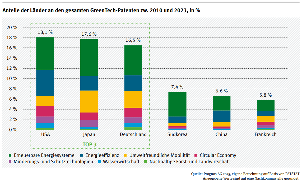 Weltweit kommen über die Hälfte aller GreenTech-Patentanmeldungen aus den USA, Japan und Deutschland. Die deutschen Patentanmeldungen konzentrieren sich insbesondere auf die Bereiche erneuerbare Energien und umweltfreundliche Mobilität. Aktuell ist Europa führend im Bereich GreenTech: Die zehn wichtigsten europäischen Länder stellen insgesamt etwa 40 Prozent der weltweiten GreenTech-Patente bereit. Allerdings hat China seine Patentanmeldungen ebenfalls deutlich gesteigert: Seit 2010 hat sich die Zahl der chinesischen Patentanmeldungen versechsfacht.