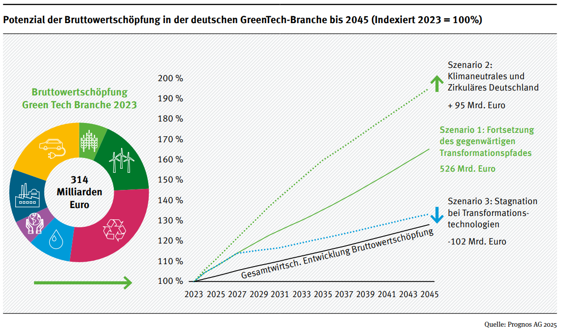 Die Entwicklung der Branche hängt stark davon ab, wie konsequent politische Ziele wie Klimaneutralität und Kreislaufwirtschaft verfolgt werden. Potenzialabschätzungen zeigen, dass die Bruttowertschöpfung der deutschen GreenTech-Branche bis 2045 auf über 620 Milliarden Euro anwachsen kann. Der globale GreenTech-Markt könnte um zusätzliche 30 Prozent wachsen, sollten Klimaziele ambitioniert verfolgt und zirkuläres Wirtschaften umgesetzt werden. Wird dieses Potenzial gezielt gefördert, entsteht dabei eine Win-Win-Situation mit Vorteilen für die Wirtschaft, Schaffung zukunftsfähiger Arbeitsplätze und dem Schutz von Klima und Umwelt.