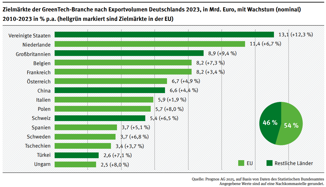 Das Balkendiagramm zeigt in welche Länder Deutschland am meisten GreenTech Produkte und Dienstleistungen exportiert. Nummer 1 ist die USA, danach folgen die Niederlande und Großbritannien. Ein kleines integriertes Kreisdiagramm zeigt, dass im Jahr 2023 ca. 45% der deutschen Exporte in EU-Mitgliedsländer ausgeführt wurden. Zielmärkte der deutschen GreenTech Branche