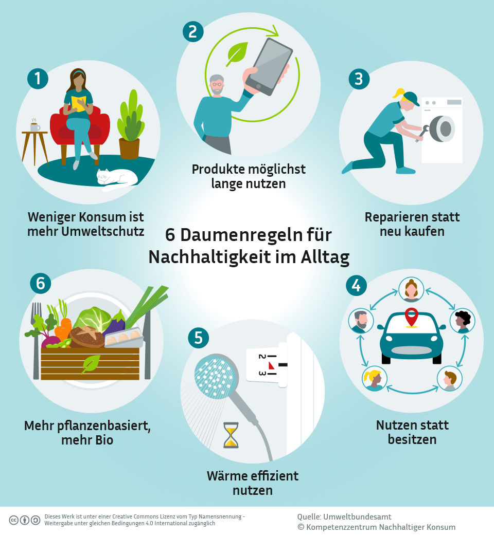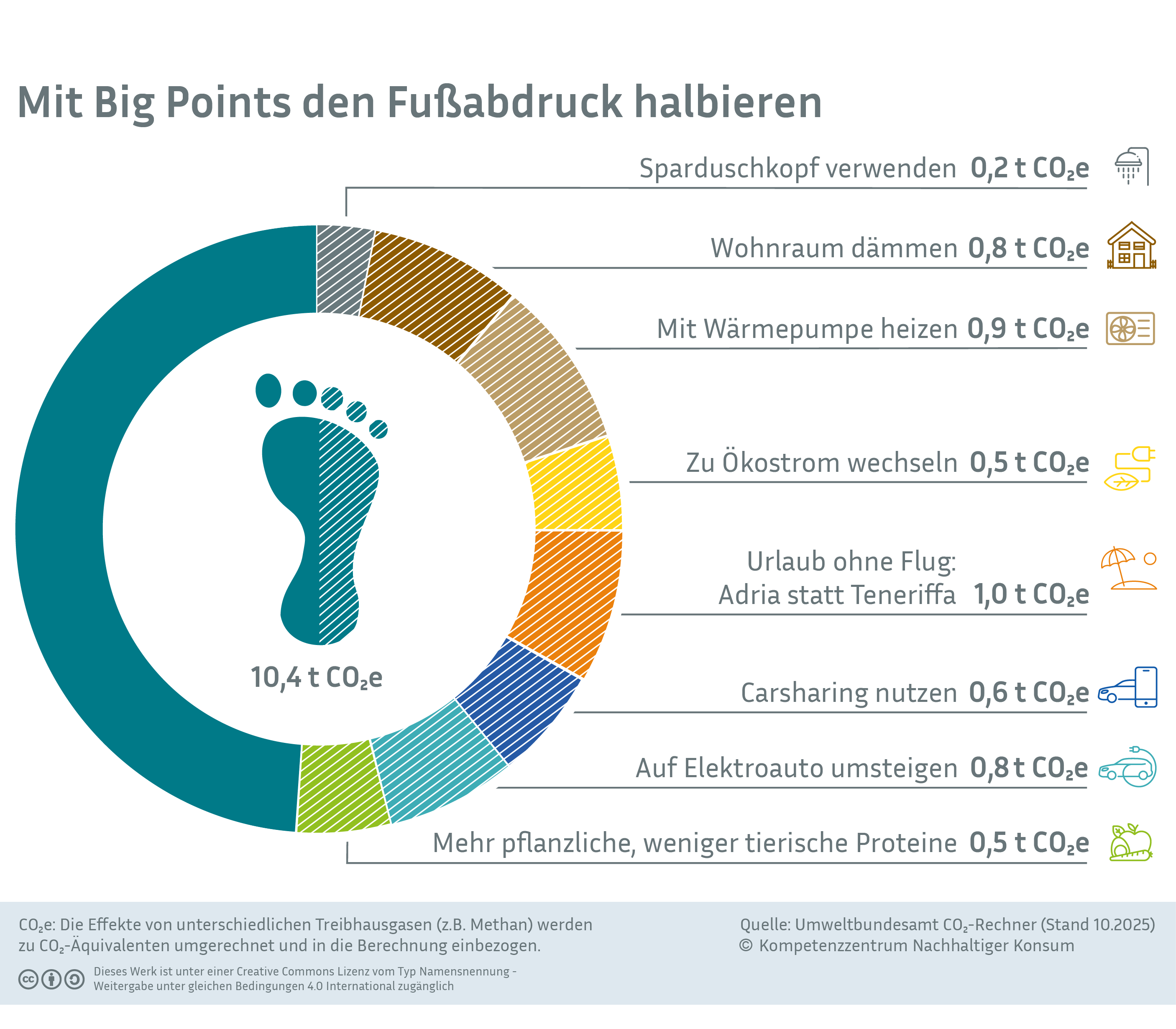 In der UBA-Studie Big Points des ressourcenschonenden Konsums konnte gezeigt werden, dass die „Big Points“ eines klimaneutralen Konsums auch in wesentlichen Bereichen die „Big Points“ eines nachhaltigen Konsums sind: Art der Energieerzeugung, Automobilität und Flugreisen, Wohnfläche und Dämmstandard, Konsum tierischer Produkte und das Konsumniveau insgesamt sind hier zu nennen. Obwohl demnach nachhaltiger Konsum viel mehr Umweltaspekte als nur Klimaschutz beinhaltet, führt der Fokus auf das „smarte“ Ziel der Klimaneutralität dazu, dass nachhaltiger Konsum umfassender und anspruchsvoller strategisch angegangen werden kann. Klimaneutral leben ist demnach aktuell das zentrale „Schlüsselziel“ für die Förderung nachhaltiger Konsummuster. Diese Aussage gilt auch, wenn man umfassendere Konzepte wie das Konzept der Planetaren Grenzen zugrunde legt.