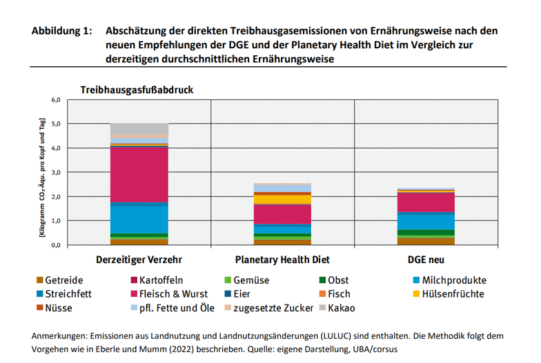 Verschiedene Ernährungsweisen führen dementsprechend zu deutlich unterschiedlichen Umweltbelastungen. So könnten beispielsweise durch die Umsetzung der Empfehlung der Deutschen Gesellschaft für Ernährung (DGE) bis zur Hälfte der derzeitigen ernährungsbedingten Treibhausgasemissionen vermieden werden.