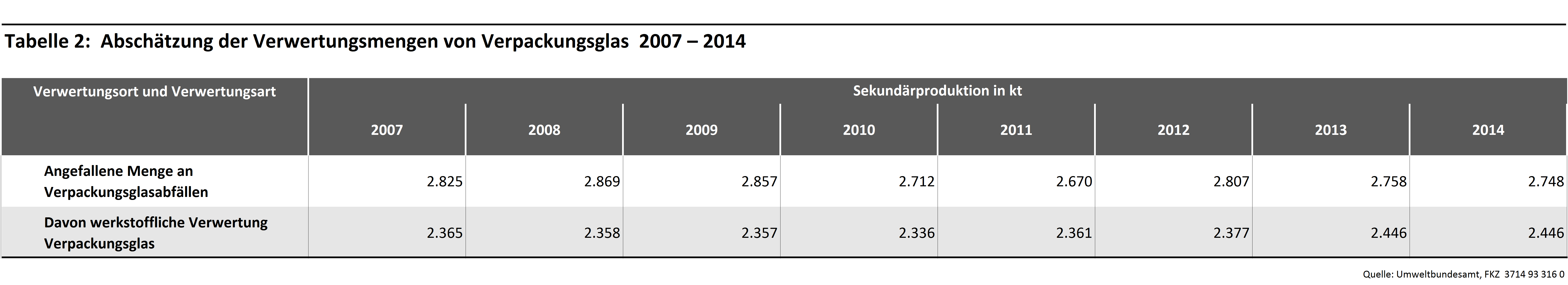 Die folgenden Tabellen geben die Erzeugnisse in Deutschland aus inländischen Glasabfällen, das zur Bilanzierung berücksichtigte Substitutionsäquivalent sowie eine Zeitreihe der angenommenen Verwertungsmengen wieder.