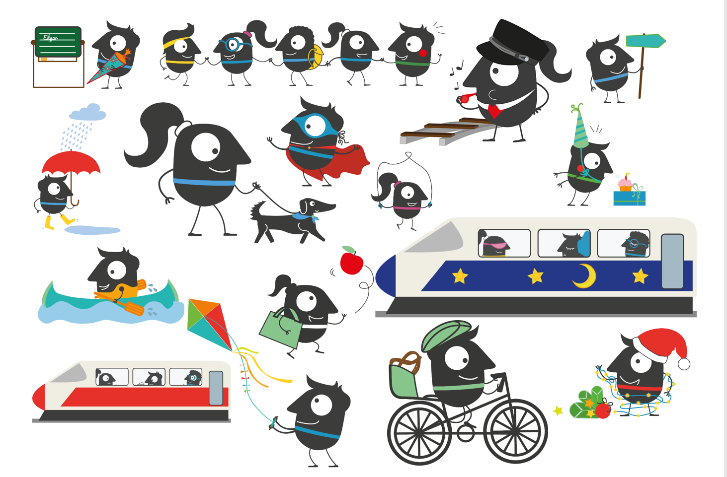 So sind sie auch aus dem Werkzeugkasten für das Entwerfen von unterschiedlichsten EMW-Materialien nicht mehr wegzudenken. Dafür stellt die Nationale Koordinierungsstelle der EMW beim UBA nun viele neue Design-Varianten zur Verfügung, die für die Öffentlichkeitsarbeit der Kommunen und anderen EMW-Akteure nützlich sein können. Neben den bisher bekannten – überwiegend von der EU-Seite zur Verfügung gestellten – Maskottchen bieten wir auf unserer EMW-Webseite Edda und Edgar in ganz neuen Kontexten und Situationen zum freien Download an: So sind sie jetzt nicht nur mit Bus, Bahn, Fahrrad oder Carsharing-Auto unterwegs, sondern auch mit dem ICE und Nachtzug, im Kanu, auf einem Schlitten oder auch zu Fuß mit dem Hund. Man kann sie auf der Geburtstagsfeier, zum Schulanfang oder in der Weihnachtszeit, beim Drachensteigen oder Seilspringen treffen. Sie stehen als Schaffner*in an der Bahnsteigkante oder weisen den Weg mit Richtungspfeilen. Und bei schlechtem Wetter gibt´s jetzt auch keine Ausrede mehr: mit Schirm und Gummistiefeln spaziert Edgar frohgelaunt durch jeden Regenschauer. Wir wünschen allen viel Spaß, Kreativität und Phantasie mit den neuen Gestaltungsmöglichkeiten.