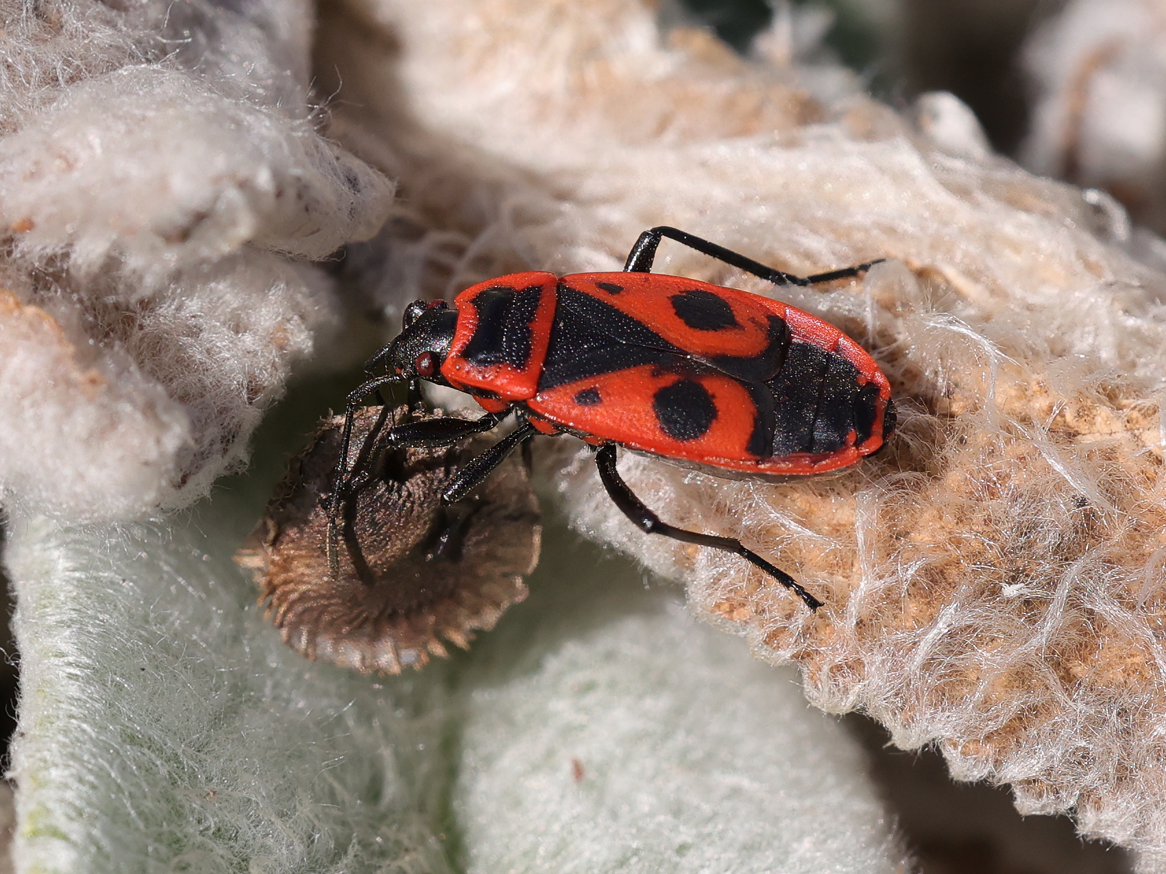 eine Feuerwanze sitzt auf einem verstrockneten Blatt