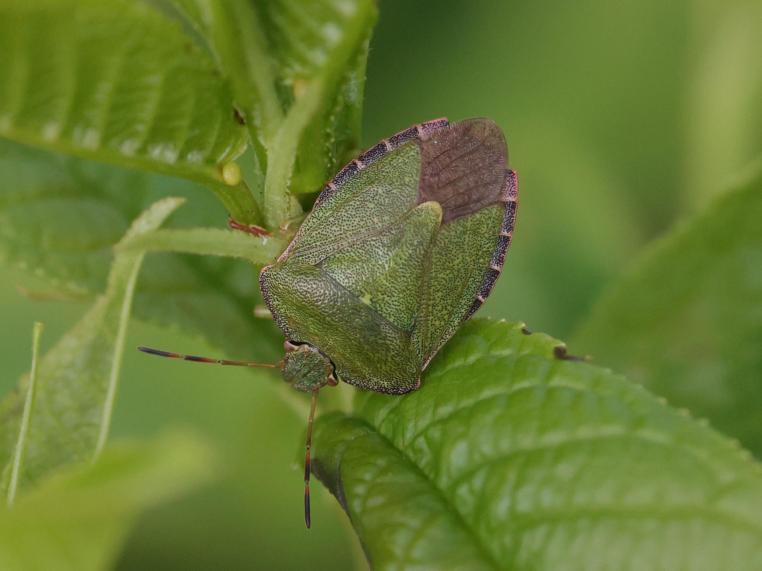 Grüne Stinkwanze auf einem grünen Blatt Grüne Stinkwanze