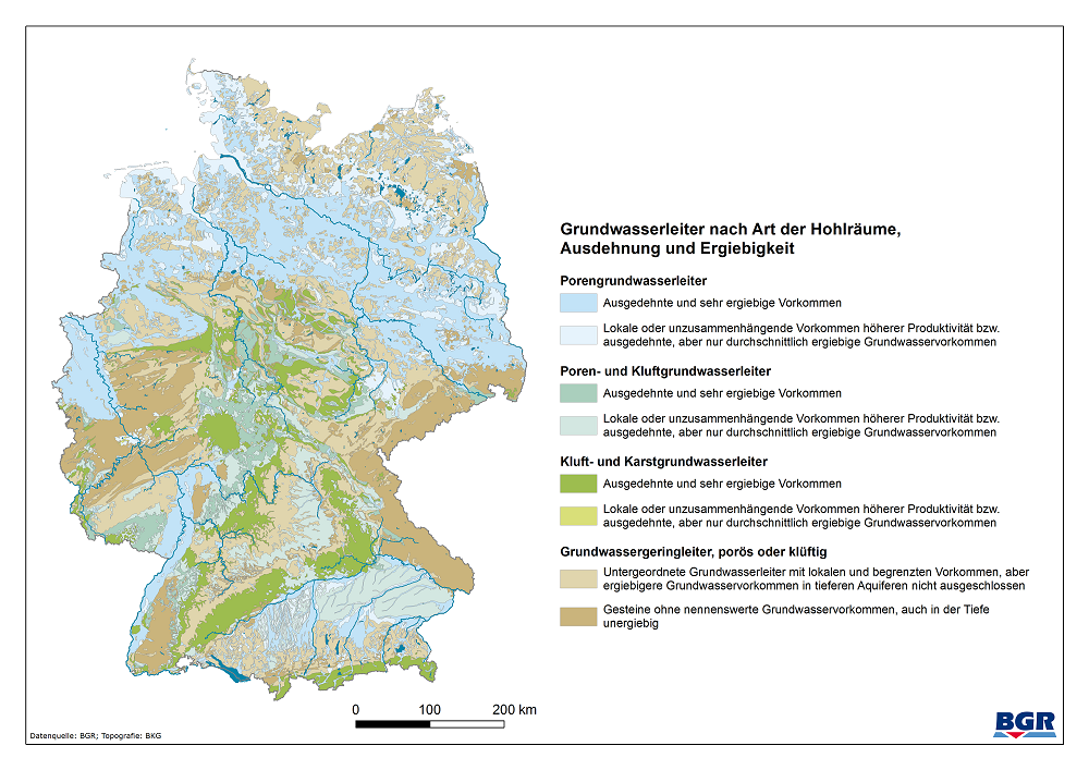 Germany is rich in groundwater. Depending on the regional hydrological and geological conditions, the groundwater is distributed spatially very differently. It can lie a few centimeters to several hundred meters below the earth's surface. The underground spaces that can store and transport the water are called aquifers. They are separated from each other by layers of non-conducting or poorly conducting rock. A distinction is made between pore, fissure and karst aquifers. Pore aquifers are characterized by loose rock in which the water fills the pore space between the individual rock grains. The pore size also determines the flow rate of the groundwater. While in clayey strata the flow rate is only a few centimeters per year, groundwater in a sandy subsoil can flow several meters per day. With a share of about 40 percent of Germany's land area, pore aquifers occur most frequently. The largest contiguous pore aquifer in Germany extends over the glacial sand and gravel layers in the North German Lowlands. But also in the foothills of the Alps in the so-called Molasse Basin, in the Upper Rhine Rift and on the Lower Rhine, large-scale and sometimes very productive pore aquifers are typical. A proportion of about 20 percent of Germany's surface area is covered by fissure or karst aquifers. Fissure aquifers are rock layers in which water flows through cracks, openings and fissures in solid rock. These layers usually store significantly less groundwater than pore aquifers, but have significantly higher flow velocities. Typical occurrences are found in the Vogelsberg region in Hesse, in the Black Forest and in the Spessart. Karst aquifers are a special form of fissured aquifers. These are calcareous and thus water-soluble solid rocks in which the cracks typical of fissure aquifers form, which the groundwater flowing through flushes out and enlarges over time. They are mainly found in the Swabian and Franconian Alb, but also in Thuringia and in a line south of the Main River to the Black Forest. A further 40 per cent of Germany's area comprises various aquifers that have very little or no groundwater resources.