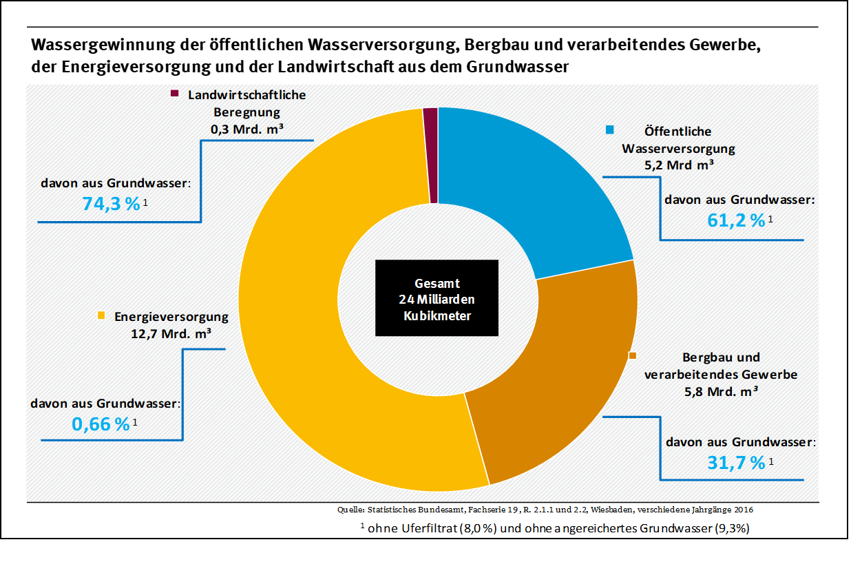 Groundwater abstractions for drinking water supply vary greatly in Germany depending on the federal state. While in Saarland, Bremen, Hamburg and Schleswig-Holstein almost all drinking water is extracted from groundwater resources, the share in Saxony and Thuringia is significantly lower, where in many cases reservoir water is also used there. In Germany as a whole, around 3.6 billion cubic meters of groundwater are extracted each year for drinking water. In addition to drinking water, groundwater is also abstracted by industry, agriculture and the energy sector for various purposes. Across all uses, around 6 billion cubic meters of groundwater are used in Germany per year. This corresponds to about 12 percent of the average newly formed groundwater.